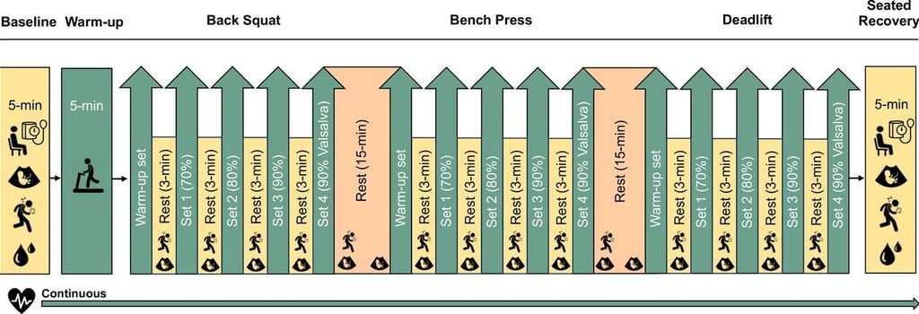 Учените са открили максималната тежест, която жените могат да вдигнат 10 пъти на упражненията заден клек, избутване от лег и мъртва тяга. Два дни по-късно жените са направили тренировка, състояща се от 4 серии от всяко едно от упражненията със 70, 80 и 90% от максималната тежест (докато са дишали нормално по време на серията) и след това още една серия с 90%, но този път със задържане на дъха по време на повторенията [4].
